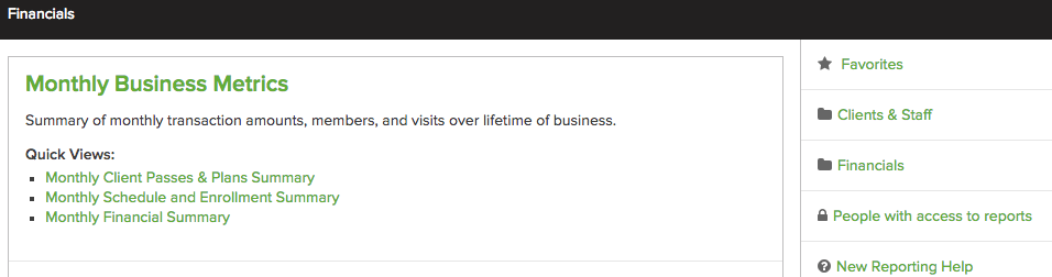The new Monthly Business Metrics Report provides a summary of monthly transaction amounts, members, and visits over the lifetime of business! This replaces the Monthly Business Summary report in Classic Reporting. To locate this report, go to Reporting and Analytics and click on the Financials tab. For more information, click here.