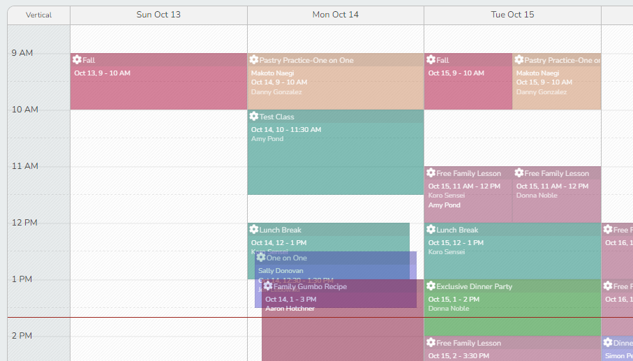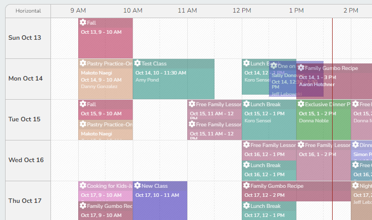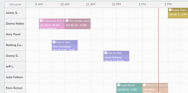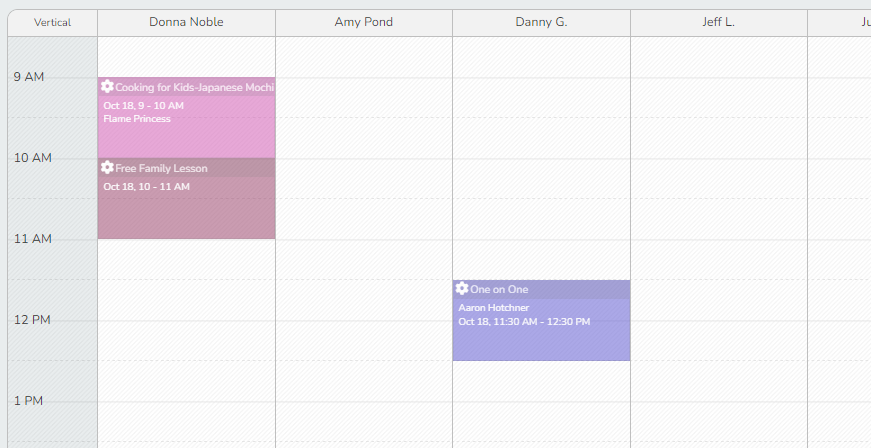 - Vertical Orientation displays the hours of the day on the left-hand side, with staff members listed across the top. Each staff member’s scheduled events appear beneath their name, making it easier to compare schedules at a glance.