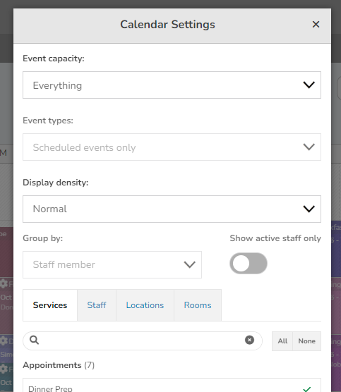 - How to Use: On the Schedule page, click on the Gear Icon to open the Calendar Settings. Use the menu to filter the service, staff member, or location you’d like to view. The schedule will update to show only the relevant services on the calendar