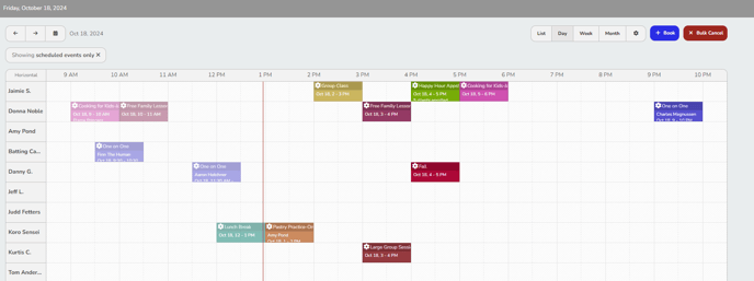 - The Day View focuses on a single day, showing all services scheduled for that date in a detailed format, and the Staff Members who are scheduled for them.