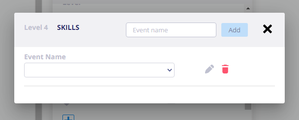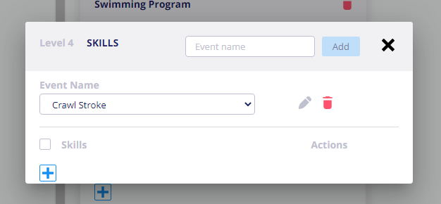 To create the skills students will need to master, you must first create the level, add the event (type of skill) then add the individual skills. MySkillChart also has provided multiple sample programs that you can choose to use. If you have chosen to use a sample program, you can edit the levels, events and skills.