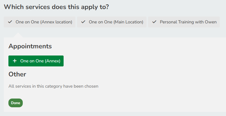 - By default, all appointment types will be added to the list. To remove them, click the name of the service. To add any that were removed, click Choose Services and click the name of the service to add back.