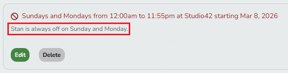 - Note: This optional note will appear in the staff member's Appointment Availability summary page.