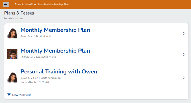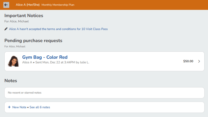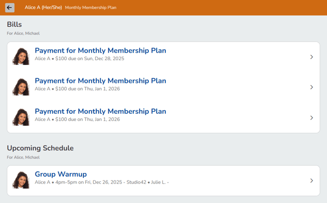 - Upcoming Schedule: The client's upcoming classes and appointments.