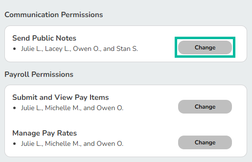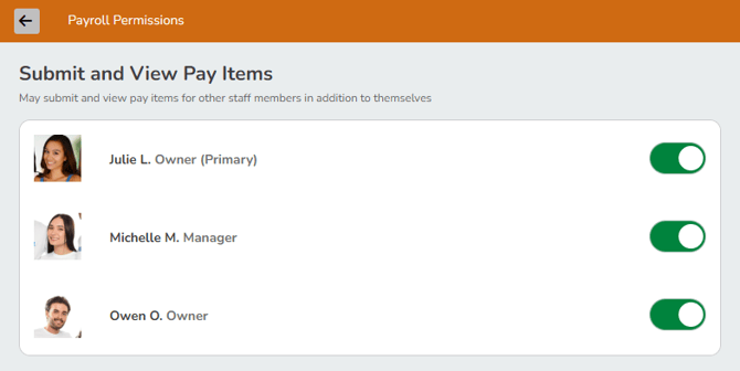 To give businesses more control, Owners and Primary Owners can configure which individual staff members can send public notes, add/mange pay rates, and add payroll items for a staff member.