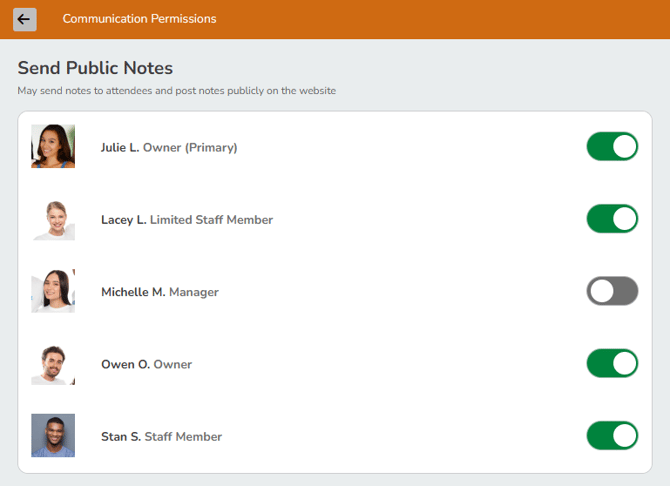 - Toggle the switch to on for staff you want to send public notes and off for those you don't.