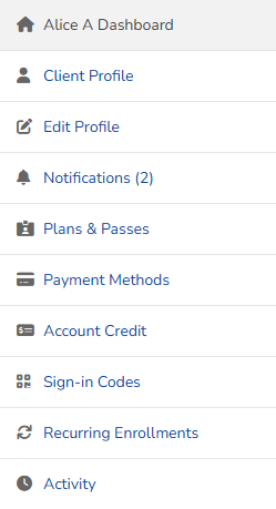1. Dashboard to see important notices, purchase requests, notes, active plans and passes, upcoming bills and scheduled events