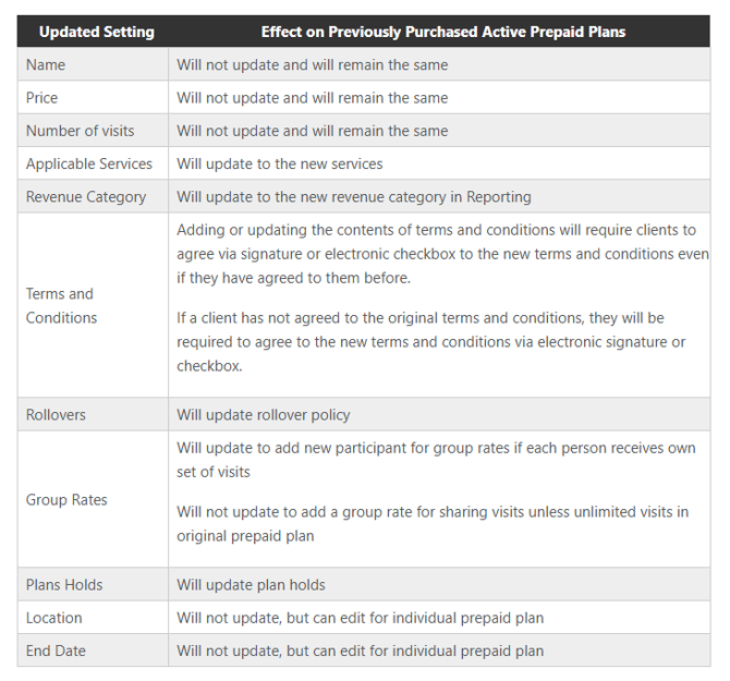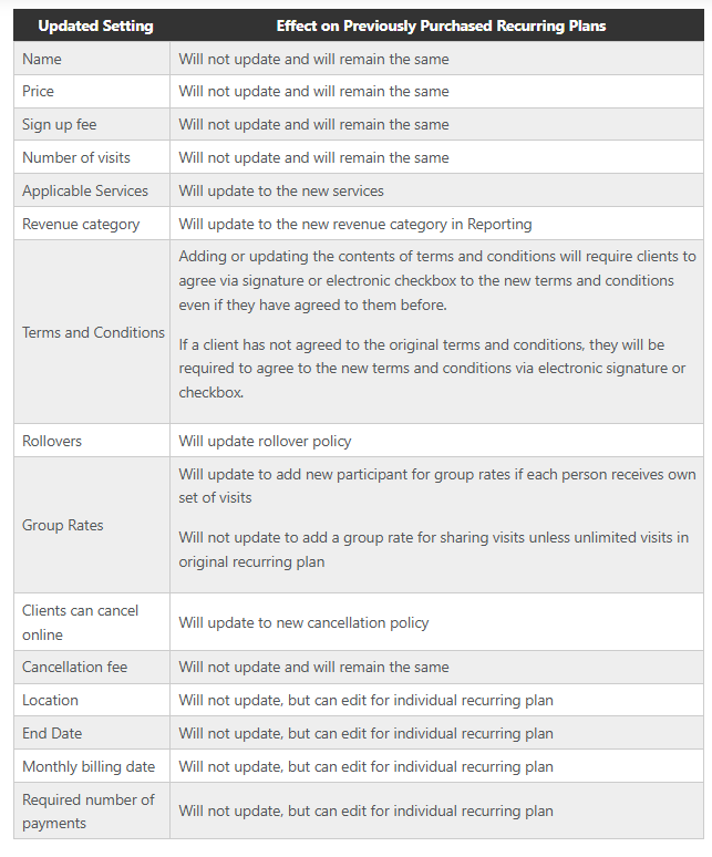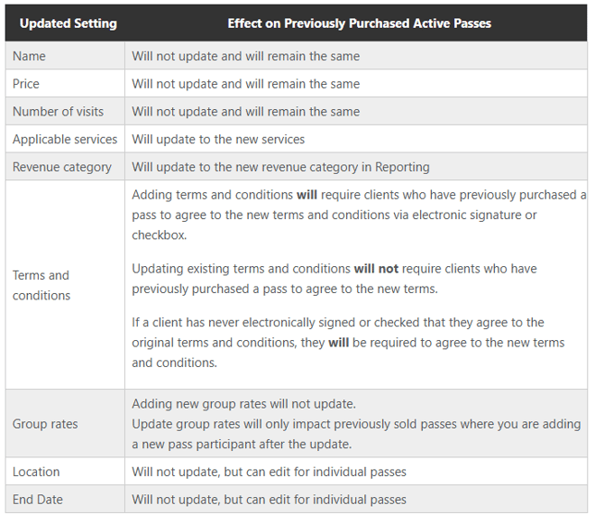 As your business evolves, you may update the passes and plans you offer for sale. Clients who purchase these after the update will receive the new version. However, for those who bought a pass or plan before the change, some updates will apply to their existing pass or plan, but not all changes carry over.