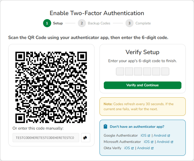 - Enter a new code in the Verify Setup box, then click Verify and Continue.