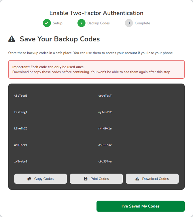 - On the next screen, you will see 10 backups codes. You may copy, print or download them to keep in a safe place. Do not share these codes with anyone else. Once you have stored them securely, click I've Saved My Codes.